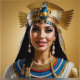 "Realismo de Cleópatra VII: Um Retrato". Uma renderização semelhante à vida de Cleópatra VII mostra-a com um nariz proeminente, olhos em forma de amêndoa e um queixo forte. Seu cabelo, trançado e adorado com ouro de penas, complementa o seu diadema de ouro real em forma de urubu, que simbolizava pureza e maternidade, e também o eterno ciclo de morte e renascimento. Os brincos de pérola e um colar intricado reforçam a presença da rainha com um olhar inteligente que reflete o seu legendário carisma e sabedoria.