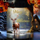 Um rótulo de vinho de Natal moderno, com rena numa paisagem fluvial com estrelas douradas estilizadas. O texto dourado está em uma imagem separada e pode ser excluído se você preferir texto personalizado.