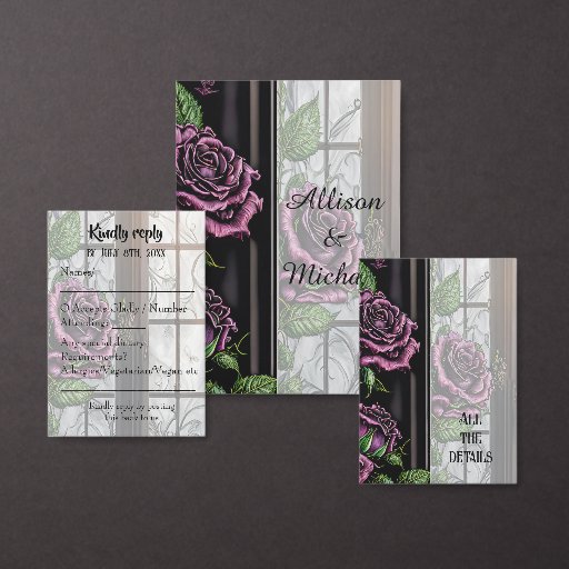 Para todos os fãs e amantes góticos de rosas - belos rosas roxos em uma janela. Rótulo de vinho excelente para o seu casamento ou qualquer outra ocasião.