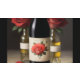 Uma garrafa de vinho bem arrumada cercada por rosas vermelhas vibrantes.