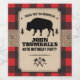 Um fundo de xadrez de búfalo vermelha contrasta com um painel de aparência de papel kraft preso por uma pulseira de burlap. O painel guarda as informações da parte que apresentam um bisão ou búfalo entre dois pinheiros. Excelente de aniversário, despedida de solteiro, evento sazonal, xadrez ou comemoração temática. O machado cruzado faz um logotipo personalizado abaixo. Disponível com produtos correspondentes.