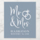 Etiquetas de garrafa de vinho azul empoeirada, elegantes e cômicas, com "Sr. & Sra." escrito em um grande roteiro branco e uma ilustração de dois anéis de casamento juntos. Adicione seu nome e data do casamento.