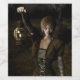 Thin female carrying a lamp and a bone through woods at night, with a dog as a companion.
