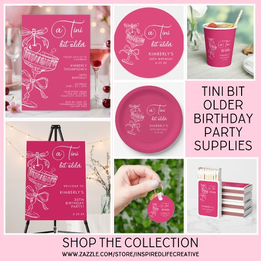 Celebrate her milestone 30th birthday with a trendy pink “A Tini Bit Older" birthday party! Personalize with your details and match the party vibe perfectly!