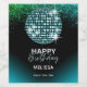 Rótulo de vinho de aniversário com uma bola de disco de turquesa brilhante com brilho azul verde sobre fundo preto.