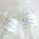Estas delicadas etiquetas da caligrafia azul de casamento boas-vindas são perfeitas para um casamento moderno. A design romântica minimalista apresenta uma magnífica e elegante tipografia azul da meia-noite num fundo branco com um aspecto simples e limpo. Personalize essas etiquetas com seus nomes e data de casamento. Essas etiquetas são perfeitas para casamentos de destino e bolsas de boas-vindas de hóspedes.