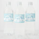 Garrafas de água personalizadas para um chá de fraldas com uma imagem encantadora das pegadas do menino azul com um contorno branco pesado. Bolinhas brancas sobre um fundo azul bebê atrás da ilustração. Uma faixa branca colocada sobre cima com seu dentro de texto personalizado.