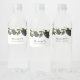 Rótulo de garrafa de água com tema floral gótico com ilustração de rosas pretos em fundo branco.