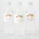 Três laranjas aquáticas num galho folheado aparecem acima do nome da futura mãe em roteiros laranja modernos nesses rótulos de garrafas de água chá de fraldas com o tema dos citros. Adicione as palavras "chá de fraldas" e a data abaixo na fonte verde sans serif.