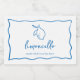 Este belo rótulo de limoncello inspirado na Itália apresenta letras cursivas em estilo manuscrito verde acentuadas com uma borda de fita ondulada em azul Mediterrâneo. Uma ilustração desenhada à mão de um limão siciliano completa o design para um visual de verão da Costa Amalfitana. Esses elegantes rótulos de limoncello para chá de noiva Mediterrâneo apresentam duas linhas de texto personalizado em letra manuscrita e tipografia serif clássica.