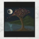 Cena natural colorida. Um rio ao luar, colinas onduladas e uma árvore colorida com folhas soprando ao vento.