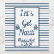 A etiqueta de vinho personalizável "Get Nauti", com riscas brancas e azuis, com riscas de marinho para a sua festa de solteira náutica, foi perfeitamente pré-vestida!