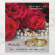Etiqueta de vinho romântico com anéis de casamento num fundo de rosas vermelhas com pérolas. Bonita como um favor de casamento ou para perguntar a sua mulher como amigas se elas serão suas madrinhas.