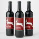 Etiquetas de vinho de cheio festivo, feitas a vermelho, com gráficos de estrelas douradas e a silhueta de um veado branco. Personalize o texto branco, na parte inferior da etiqueta, para o seu presente de Natal ou festa de Natal. Os produtos correspondentes estão disponíveis.