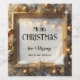 Um rótulo clássico de vinho de Natal com uma moldura estilizada de ouro com ornamentos e lanternas e alguma neve.