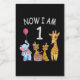 Feliz primeiro aniversario. Design engraçado e adorável com um elefante giro, dois furões e uma girafa celebrando seu aniversário no zoológico.