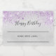 Um fundo com aparência de prata falsa, decorado com pó de brilho púrpura e lavanda. Com o texto: 50 e Parabéns. Feliz Aniversário é escrito com um moderno estilo escrito à mão. Adicione o nome da aniversariante/mulher e o(s) seu(s) nome(s) manualmente. Perfeito para presentes de comida caseira.