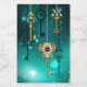 Chaves Douradas e antigas com engrenagens e marcadores penduram em correntes douradas sobre fundo verde luminoso.