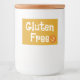 O rótulo de armazenamento de na moda que identifica o conteúdo é GLUTEN FREE, com o símbolo de grão cruzado.