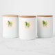 Um rótulo de jarro de comida que diz "Fresco Guacomole" (guacomole pode ser personalizado para dizer o que você gosta). Projetado com uma vibrante pintura aquosa de abacate de cheio emparelhado com meio abacate sentado em um leito de folhas. Sombras verdes e amarelas vívidas fazem com que esta fruta ganhe vida. Colocado sobre um fundo colorido de pêssego.