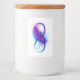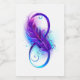 Símbolo infinito com uma bela pena pintada em cores roxas e azuis brilhantes sobre fundo branco.