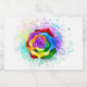 Rosa grande e florescente com pétalas arco-íris sobre fundo branco, pintadas com pedaços de tinta colorida e brilhante. 3d