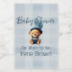 Crie uma etiqueta única de comida de chá de fraldas com cores azuis e um ursinho cônico casual com gingham e balões. A frente inclui o nome do evento e o convidado de honra que você pode editar para suas necessidades. Urso Jean Baby design. Use a modelo para criar uma etiqueta especial de comida personalizada para o seu chá de fraldas.