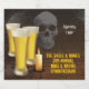 Uma rodada de cerveja fria e ouro está pronta perto de um crânio assustador em uma mesa escura com aranhas e teias ao seu redor. Use para o seu próprio halloween ou para um Halloween, fantasia ou festa de aniversário de Halloween. Disponível com produtos correspondentes.