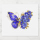 Borboleta de flores cinza, azul, safira, espumante com asa decorada com flores preciosos azuis com folhas de ouro sobre fundo branco.