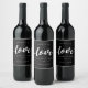 Etiquetas modernas e elegantes de vinho de casamento são perfeitas para rotular vinhos nas suas bolsas de boas-vindas, favores ou para as suas mesas de recepção. As etiquetas pretas de Matte contêm "torcida pelo amor" numa combinação de letras de blocos e escritos à mão, com os seus nomes, data de casamento e varietal do vinho.