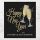 Este rótulo da garrafa de vinho apresenta um gráfico de dois copos de vinho espumante, um confete colorido e o texto do roteiro que diz: Feliz ano novo. O texto personalizado na parte inferior permite personalizar com seu nome.