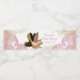 Rótulos de garrafa de água para chá de bebê menina com adorável bebê étnica com colar de pérolas sentada em um par de sapatos de salto alto dourados em um belo fundo rosa e dourado. Esses rótulos de garrafa de água para chá de bebê são facilmente personalizados para o seu evento com o seu texto no estilo de fonte de sua escolha. Você também pode alterar a cor do fundo.