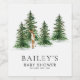 Rótulos de vinho para Chá de Bebê de Inverno Rústico são projetados com árvores de pinheiro em aquarela e um pequeno cervo fofo. Itens correspondentes em nossa Loja Cava Party Designs.