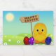 Ilustração de Páscoa bonita, com um pintinho segurando um cartaz de madeira com saudação de Felz pascoa, sentado num campo de flores ao lado de ovos coloridos de Páscoa.