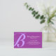 A inicial do seu sobrenome aparece em uma enorme letra púrpura, clara, à esquerda deste cartão de visita sobre um fundo roxo, enquanto seus detalhes de contato aparecem à direita. Este design é simples, minimalista, profissional e genérico, adequado para quase qualquer tipo de negócio ou indústria.