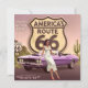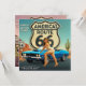 A bold, vintage-inspired Route 66 design featuring the iconic highway shield, a blue classic convertible, and a glamorous pin‑up pose set against a Southwest desert backdrop—perfect for road‑trip lovers, Americana fans, and retro garage décor
