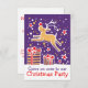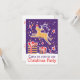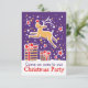 Convidado para a festa de Natal de Reindeer. Convidado de festa sazonal ilustrado e bonito, personalize com seus próprios detalhes. Convite de festas de Natal bonito com renas saltando sobre presentes em roxo, ouro amarelo, branco e vermelho. Ilustrada e projetada exclusivamente por Sarah Trett.