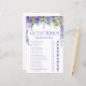 Esta bela wisteria roxa adivinha quem? A folha de chá de panela é elegante e encantadora - perfeita para qualquer jardim, botânica, rústica, romântica, floral, formal ou casamento vintage. Sua combinação requintada de flores roxas e rosa, roxas e cor-de-rosa graciosas, e verde sábia é florida, delicada e bela. Este jogo fácil e divertido traz muitas risadas a qualquer chá de panela! Basta dar uma folha a cada convidado (não se esqueça das canetas) e deixar a diversão começar! Ficarão espantados com quantas pessoas conhecem algumas das respostas. Para tornar este jogo de chá de panela seu, basta selecionar Personalizar este modelo e digitar o nome da noiva e o nome do noivo.