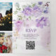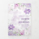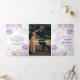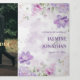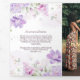 O convite trifold apresenta um design floral suave em estilo aquarela. Grupos de flores delicadas em tons de roxo, lavanda e rosa florescem na parte superior e inferior, entrelaçados com folhas verde-claro e galhos sutis. O layout cria uma moldura natural suave ao redor do centro, chamando a atenção para dentro, mantendo uma estética leve e elegante em todo o convite. A paleta de cores parece romântica e fresca - perfeita para uma celebração de primavera ou verão.