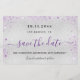 Uma cinta e moda Salve a placa Date para uma festa de aniversário 40th (ou qualquer idade). Um fundo metálico moderno, falso e prateado, decorado com pó de brilho púrpura. Personalize e adicione uma data e nome/idade 40. Letras pretas e roxas coloridas. O texto: Salvar a Data é gravado com um script de estilo com letra de tendência grande.