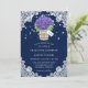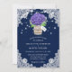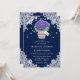 Convites de casamento roxos e azuis com hipnagas e dentro de mason com buquê de de hálito de bebê em uma pá e fundo de renda floral. Design de cartão perfeito para convidar seus hóspedes para sua festa de casamento roxa e azul rustica do país inspirada em flores de hydrangea. Cartão fácil de personalizar.