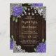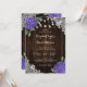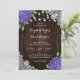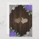 Convites de casamento de hipnésia roxa, russos, inspirados por flores de hydrangea roxas em um fundo de madeira rústica e rendas.
