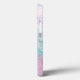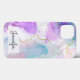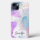 Uma capa de telefone com uma bela pintura artística. Criada com tintas de álcool fluídas. Cores roxa, verde e azul fluindo juntas. Fitas finas e onduladas de ouro se entrelaçam com essas cores suaves e gentis.