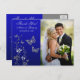 Esta borboleta azul-real, azul-marinho e cinza prateada floral graças ao cartão de posto de fotos de casamento tem borboletas prateadas e flores, junto com uma área de modelo para você carregar sua foto digital que corresponde ao convite de casamento mostrado abaixo. Se você precisar de outros itens correspondentes neste design, envie seu pedido por e-mail para niteowlstudio@gmail.com.