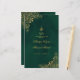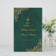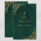 Cartões de Menus do Casamento Islâmico do Real Emerald Green Dourado Florals. Este cardápio de casamento é realmente elegante! A frente tem um belo fundo verde esmeralda com delicados florais de ouro. A caligrafia é requintada, começando com 'Bismillah' e a frase árabe 'wa khalaqnakum azwaja' (que significa 'E nós criamos você em pares'), seguida dos nomes dos casais, da data do casamento e do local. O verso também é esmeralda verde, e ele exibe elegantemente 'O Menu' no topo. O cardápio em si é belamente apresentado na caligrafia dourada, listando todas as deliciosas iniciações, cursos principais e sobremesas. É um toque muito especial para sua celebração de casamento