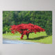 Uma pintura digital de uma árvore solitária da Poinciana Real em floração de cheio contra um fundo de grama verde e árvores em uma estrada montanhosa em Porto Rico.