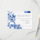 Cartão de Resposta RSVP que inclui: data de resposta, nome de convidado, lugares reservados, respostas e opções de seleção de menu. Você pode apagar o texto em qualquer campo se não for necessário e nós podemos configurar informações personalizadas se precisar de assistência. Trabalho de arte de aquarela pintada manualmente moderna inspirada por um belo e antigo mural de azulejo chinês. Flores azuis e brancas de cobalto, pássaros e pagodes estilizados todos pintados em variadas tonalidades de azul no estilo decorativo da cerâmica de porcelana. Audrey Jeanne Roberts, Copyright todos os direitos reservados.