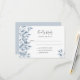 Um cartão RSVP elegante e simples para um casamento com modelos para resposta por data e nomes. Um fundo branco chic na frente. Decorados com prigos azuis botânicos de cor aquosa e folhagem. O título Resposta Rápida é escrito com um grande script de estilo manuscrito moderno. Fundo azul empoeirado, cinzas escuras.