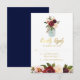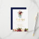 Cartões de resposta de casamento outonal elegante com um fundo branco clássico na frente e um fundo azul marinho no verso, ambos podem ser alterados para qualquer cor, um jarro de pedra rústico, uma etiqueta com as iniciais do casal, um burgundy elegante, vermelho marsala e um arranjo floral aquarela rosa, e um modelo de RSVP de casamento moderno.