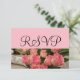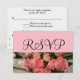 RSVP de Casamento escrito em elegante roteiro preto contra fundo rosa pastel, Bonito rosas rosa e buquê verde. Personalize o verso da tipografia negra contra fundo branco nítido. Fotografia original e Design por TamiraZDesign.